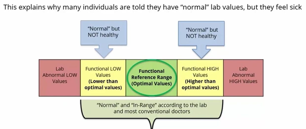 The values you receive on your labs from your conventional medicine doctor may be deemed "normal," but they are not necessarily healthy. Unfortunately, standard lab reference ranges represent a total population regardless of health status, meaning it's a mix of healthy and unhealthy people. This creates a wider bell-curve and can vary from lab to lab.
